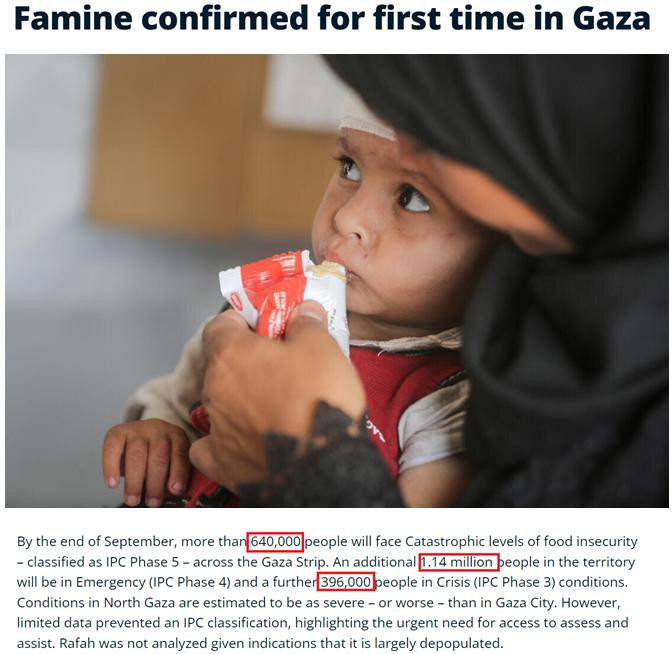 联合国粮农组织、联合国儿童基金会、世界粮食计划署和世界卫生组织近日联合发布的报告指出,加沙地带饥饿和贫困正在广泛发生,预计到9月底,加沙地带将有超过64万人在食品安全方面处于最严重的“灾难”阶段,114万人处于次一级的“紧急”阶段,另有39.6万人处于“危机”阶段。