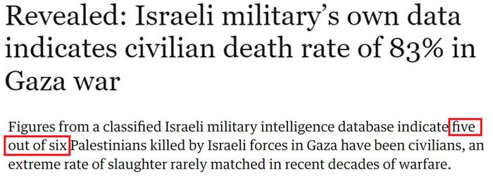最近,多家外国媒体发布的一份联合调查称,以军机密情报数据库的数据显示,以军在加沙地带打死的巴勒斯坦人有超八成是平民,相当于加沙地带每6名死者中有5名是无辜平民。
