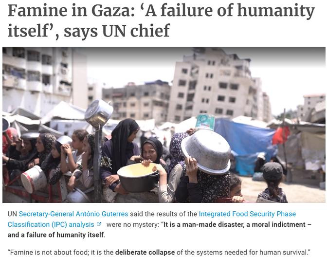 联合国秘书长古特雷斯22日通过发言人办公室就加沙地带出现的饥荒发表声明表示,当前局面并非自然形成,而是一场人为的灾难;这不仅是对人类良知的道德控诉,更是人性的失败。饥荒不仅意味着粮食短缺,更意味着人类赖以生存的基本体系正在被蓄意破坏。
